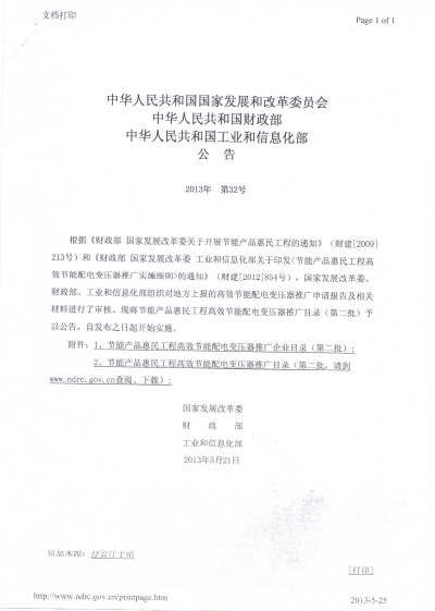 近日,國家發(fā)改委、財(cái)政部、工信部正式公布《節(jié)能產(chǎn)品惠民工程高效節(jié)能配電變壓器推廣企業(yè)目錄(第二批)》(http://www.ndrc.gov.cn/zcfb/zcfbgg/2013gg/W020130524556402255141.pdf ) ,我公司生產(chǎn)的節(jié)能配電變壓器成功入圍名單之列。